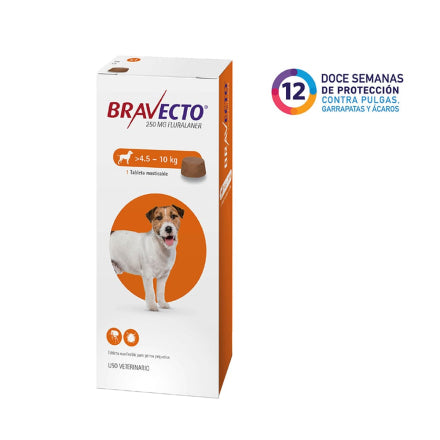 Bravecto ofrece una protección de larga duración contra pulgas y garrapatas para perros de 4.5 a 10 kg, con la comodidad de una tableta masticable fácil de administrar. Con una sola dosis, tu perro estará protegido durante hasta 12 semanas.