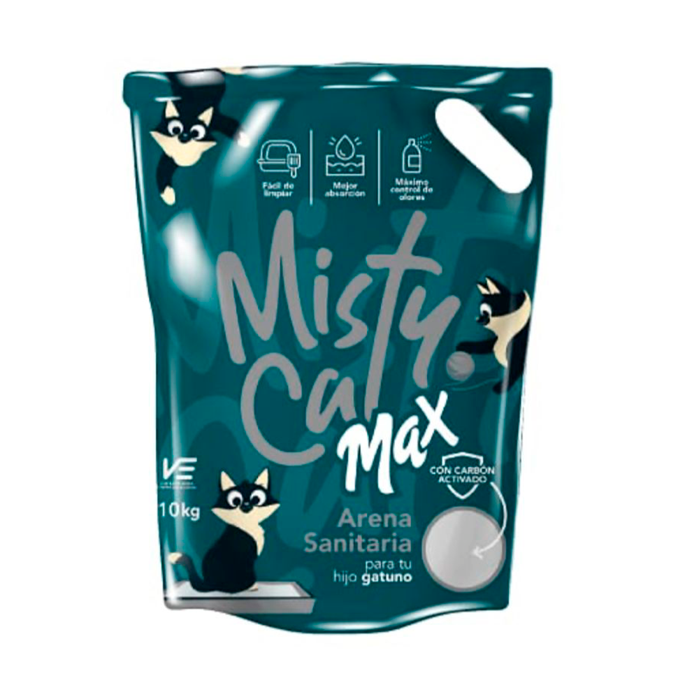 Arena Misty Cat es aglomerante de fina granulación, absorbe y neutraliza inmediatamente los olores de la orina y heces de los gatos, gracias a las partículas de carbón activado que contiene. 99% libre de polvo.