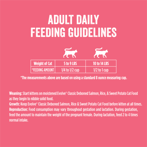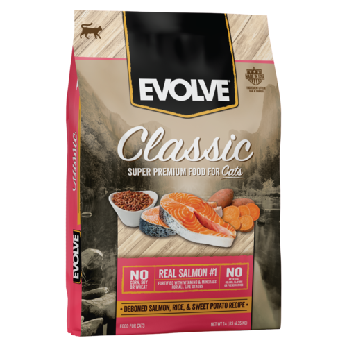 Evolve Classic Deboned Salmon, Rice, & Sweet Potato Recipe es un alimento para gatos de gran sabor hecho con salmón, arroz integral, patatas dulces, cebada, guisantes, zanahorias, arándanos y arándanos. Este alimento no contiene trigo, maíz ni soja y produce un delicioso aroma que su gato encontrará irresistible. Porque nos importa la calidad de nuestra comida para gatos, hemos elegido que el salmón auténtico sea el ingrediente número 1. Esta formulación única engloba todos los ingredientes necesarios para mantener a su gato feliz, sano y con energía. Por lo tanto, al elegir la comida para gatos Evolve Classic Deboned Salmon, Rice, & Sweet Potato Recipe, ¡está eligiendo un futuro brillante y saludable para su gato!